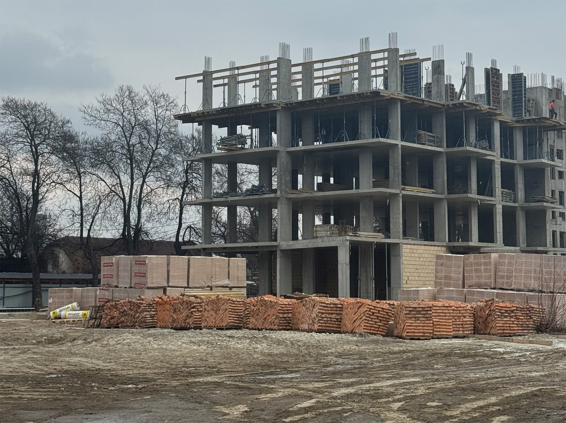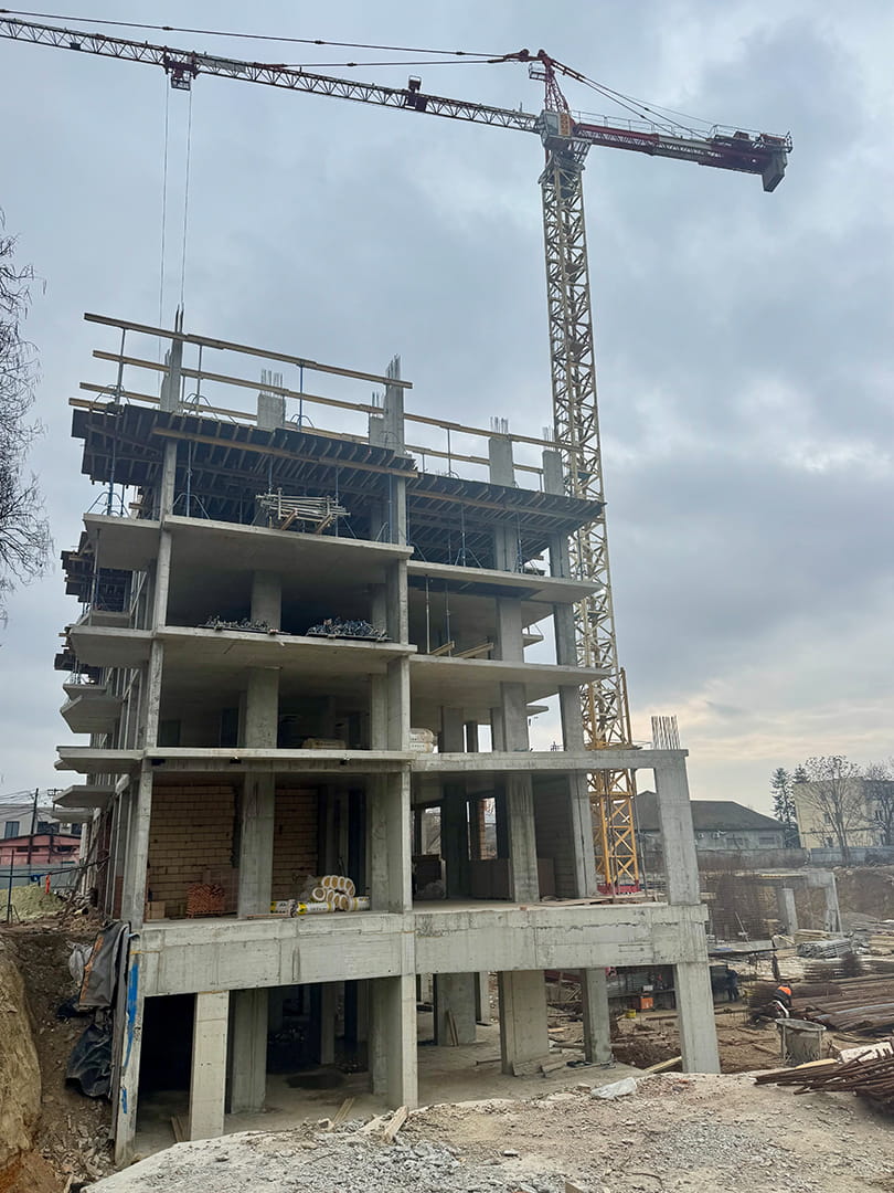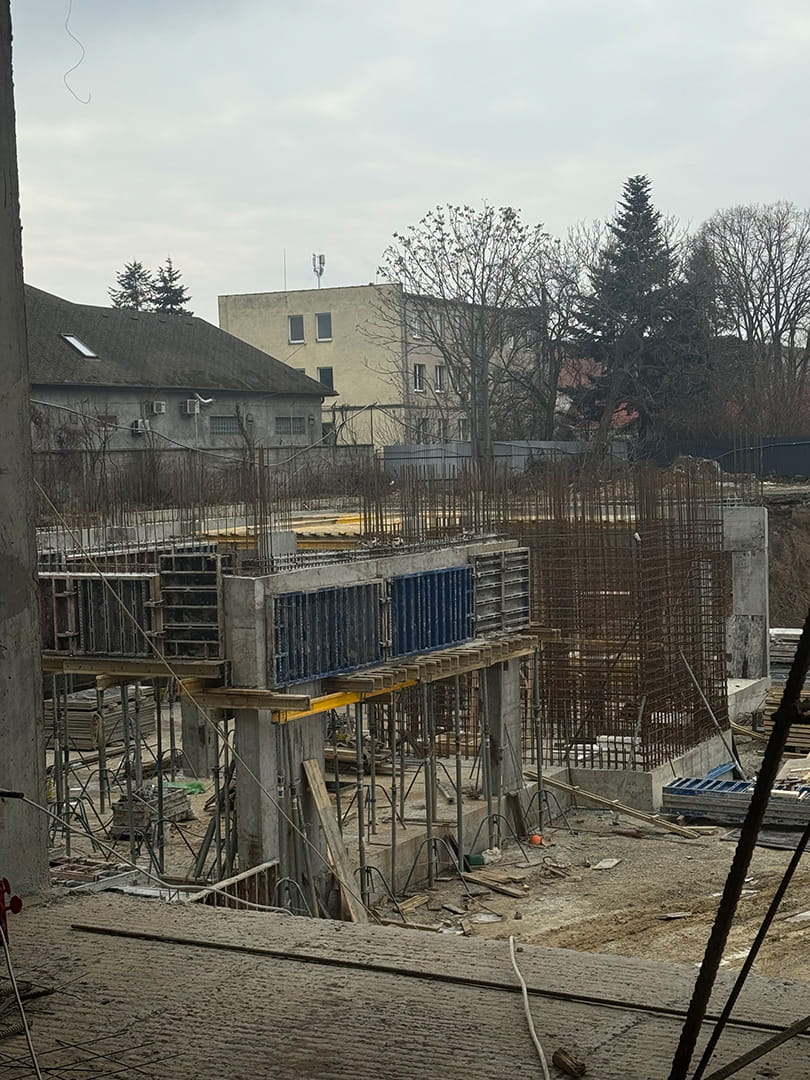 На об’єкті триває активна фаза зведення монолітного залізобетонного каркаса, що є основою міцності та довговічності майбутнього комплексу.